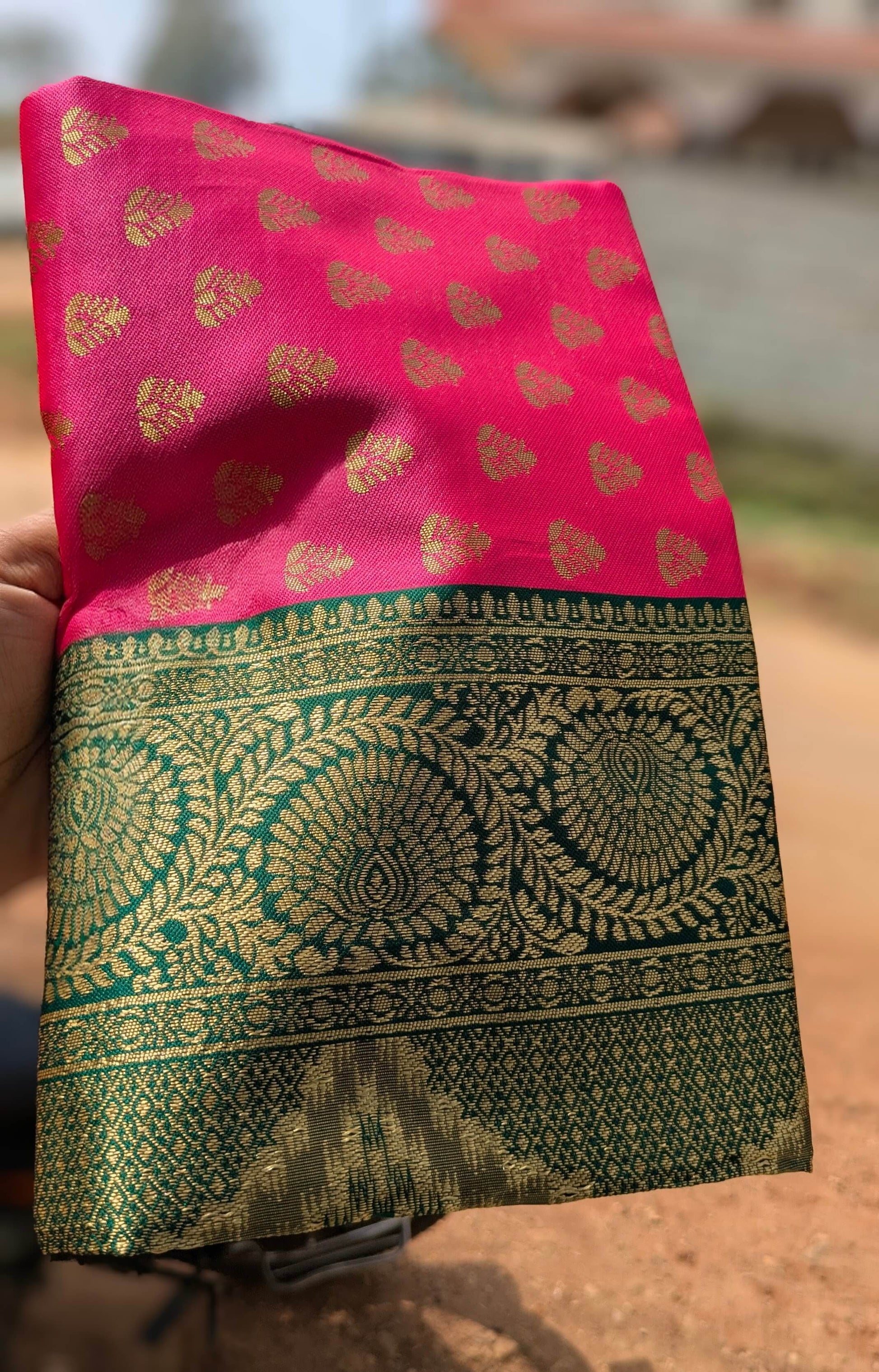 Discover the timeless beauty of this classic semi Mysore silk saree featuring rich colors and traditional golden zari work. A perfect blend of affordability and elegance that brings South Indian tradition to your wardrobe.
